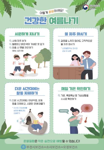 김은옥 부천시보건소장은 “독거노인과 만성질환자 등 건강취약계층은 폭염에 특히 민감한 만큼, 폭염특보가 발효되면 건강관리 수칙을 반드시 지켜야 한다”며 “방문건강관리사업을 통해 폭염 피해를 줄이고 어르신들이 건강한 여름을 보낼 수 있도록 힘쓰겠다”고 말했다.