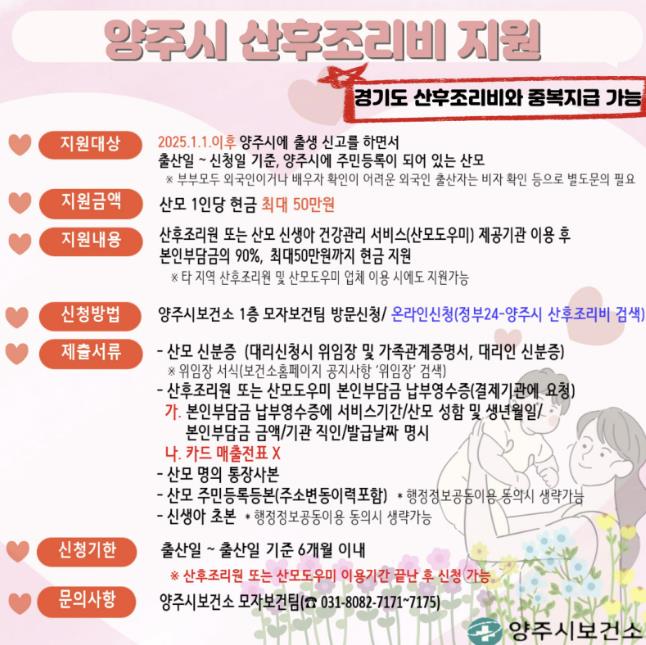 [무한뉴스=정승훈 기자] 양주시보건소가 2025년 1월 1일 출생아부터 관내 출산가정을 대상으로 ‘양주시 산후조리비 지원사업’을 시행하고 있다.