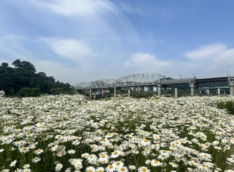 시에 따르면, 유난히 추웠던 지난겨울을 이겨내고 파란 하늘 아래 피어난 수만 송이의 계란꽃(샤스타데이지)이 금강변 미르섬 꽃단지와 산책길을 따라 장관을 이루고 있다.