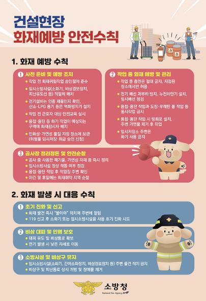 화재 예방 수칙은 ▲사전 준비 및 예방 조치 ▲작업 중 화재 예방 및 관리 ▲공사장 정리정돈 및 안전순찰 등 3가지 주요 항목으로 구성되어 있으며, 화재 발생 시에는 ▲초기 진압 및 신고 ▲비상 대피 및 인명 보호 ▲소방시설 및 비상구 유지 등 신속한 대응 절차가 포함되어 있다.