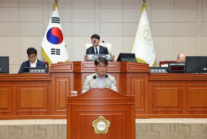 | ▲ 8월 13일 제339회 임시회 제2차 본회의에서 고건 의원이 해창만간척지 조사특별위원회 연장의 건 제안 설명을 하고 있다. |