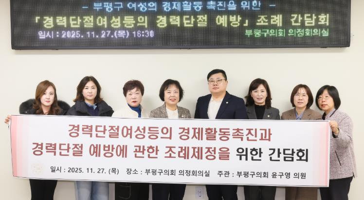 [무한뉴스=양현명 기자] 인천 부평구의회는 지난 27일 의회 의정회의실에서 윤구영 의원(국민의힘, 삼산2동, 부개2ㆍ3동)이 대표발의한 '인천광역시부평구 경력단절여성등의 경제활동 촉진과 경력단절 예방에 관한 조례'제정을 위한 간담회를 진행했다.