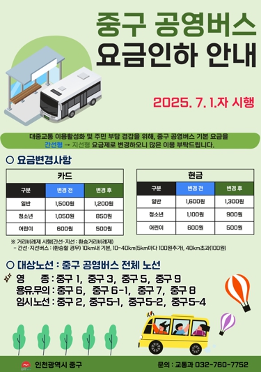 이번 인하 조치에 따라 올해 7월 1일부터 기본 요금은 카드기준 ▲일반 1,500원 → 1,200원 ▲청소년 1,050원 → 850원 ▲어린이 600원 → 500원으로 변경된다. 대상은 중구 공영버스 전체 12개 노선이다.