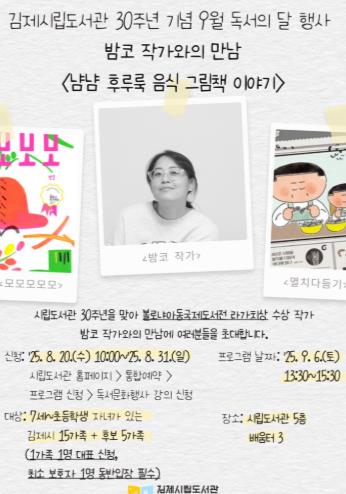 [무한뉴스=정민정 기자] 김제시립도서관은 개관 30주년을 기념해 9월 독서의 달 행사로 오는 9월 6일 토요일 오후 1시 30분부터 밤코 작가와의 만남을 진행한다고 밝혔다.