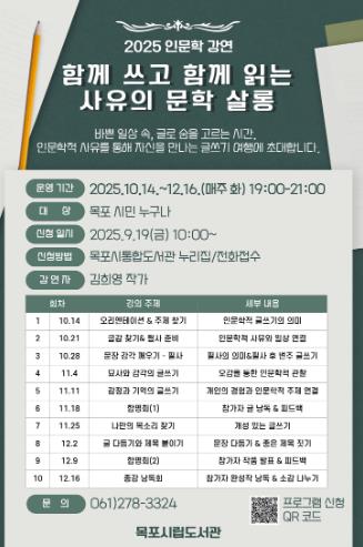 [무한뉴스=정민정 기자] 목포시립도서관은 오는 10월 14일부터 매주 화요일 오후 7시, 인문학 글쓰기 강연 '함께 쓰고 함께 읽는, 사유의 문학 살롱'을 운영한다.