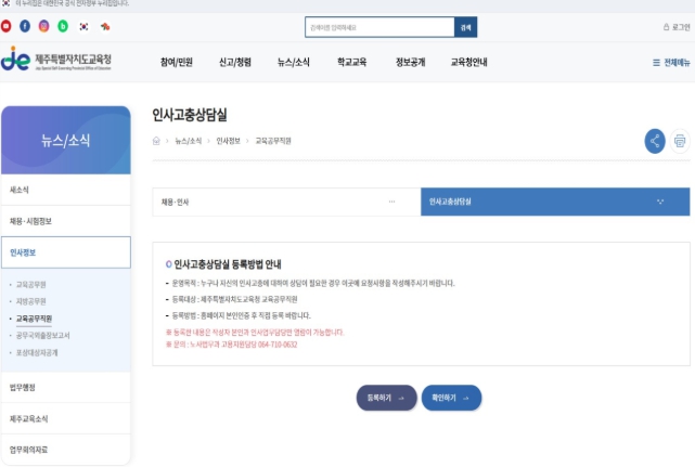 상담은 제주특별자치도교육청 누리집 내 ‘뉴스·소식 → 인사정보 → 교육공무직원 → 인사고충상담실’ 메뉴를 통해 가능하다.