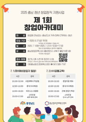 지원 자격은 창업에 관심 있는 충남도내 거주/대학/근무하고 있는 청년을 대상으로 이루어진다. 접수 기간은 6월 18일부터 6월 27일 오후 6시까지이며 공고 포스터 링크. QR을 통해 온라인 신청이 가능하다.