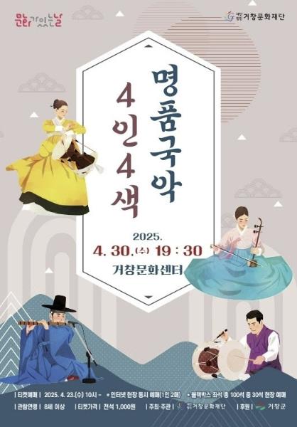 [무한뉴스=최진수 기자] (재)거창문화재단은 오는 4월 30일 오후 7시 30분에 거창문화센터 공연장에서 거창 지역 국악인들이 마련한 ‘명품국악 4인4색’을 개최한다.
