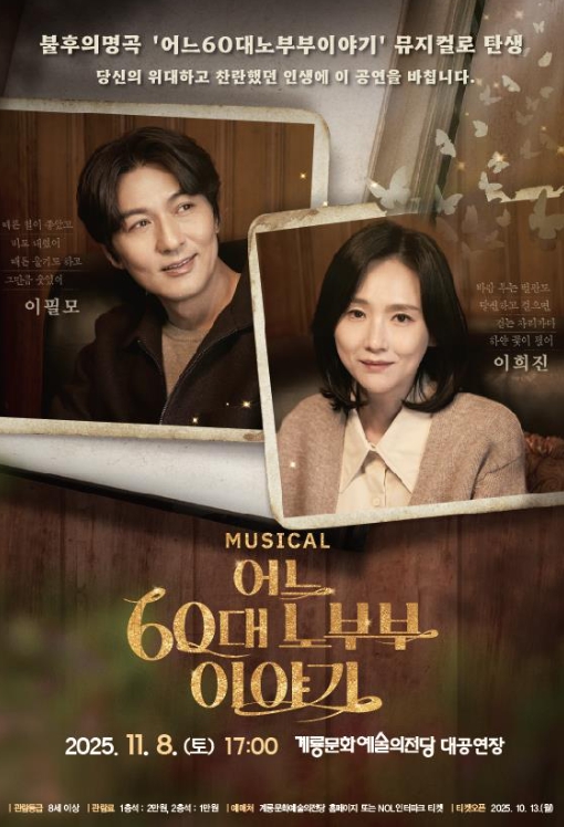 [무한뉴스=정민정 기자] 계룡시는 오는 11월 8일 오후 5시, 계룡문화예술의전당 대공연장에서 뮤지컬 ‘어느 60대 노부부 이야기’를 공연한다.