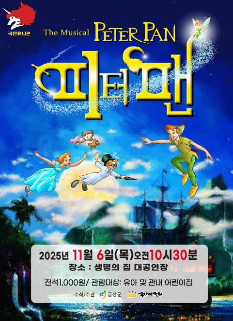 [무한뉴스=정민정 기자] 금산군은 지역 내 아이들에게 수준 높은 문화예술을 전하기 위해 어린이 뮤지컬 ‘플라잉 피터팬’을 11월 6일 오전 10시 30분 금산다락원 생명의 집 대공연장에서 공개한다.