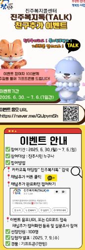 [무한뉴스=최진수 기자] 진주시는 복지 접근성을 높이고 시민과의 소통강화를 위해, 진주복지콜센터에서 운영하는‘진주복지톡(TALK)’채널을 통한 친구추가 이벤트를 6월 30일부터 7월 6일까지 7일간 진행한다.