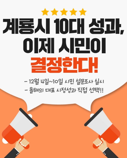 [무한뉴스=정민정 기자] 계룡시는 12월 4일부터 10일까지'2025 계룡시를 빛낸 10대 성과'시민 설문조사를 실시한다고 밝혔다.