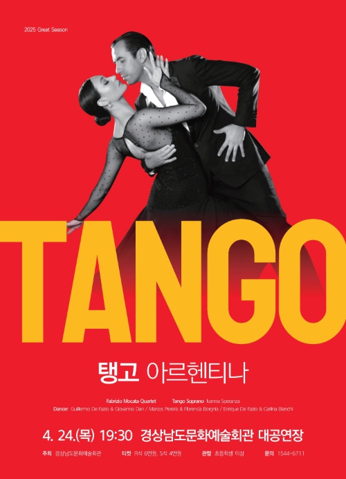 [무한뉴스=최진수 기자] 경남문화예술회관은 오는 4월 24일 목요일 오후 7시 30분 대공연장에서 탱고 아르헨티나 Tango Argentina 내한 공연을 개최한다고 밝혔다.