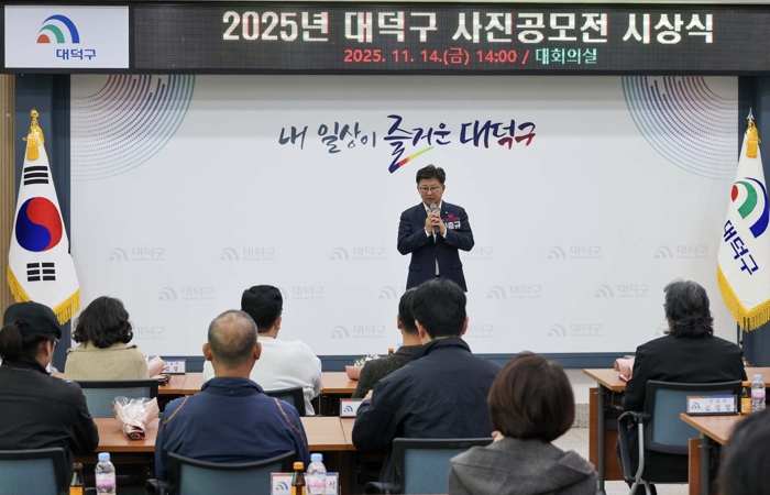 ▲ 최충규 대덕구청장이 14일 구청 대회의실에서 열린 ‘2025년 대덕구 사진 공모전’ 시상식에 참석해 수상자들에게 인사말을 전하고 있다.