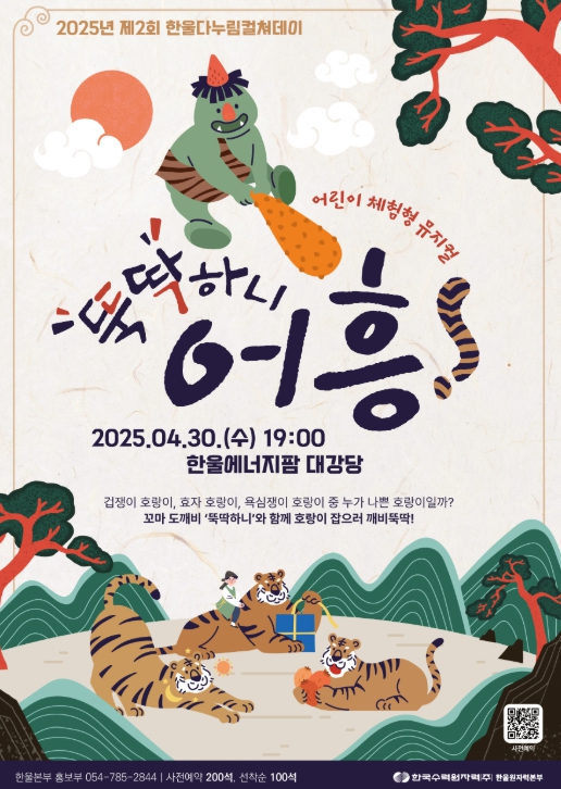 [무한뉴스=최진수 기자] 한국수력원자력(주) 한울원자력본부는 4월 30일 19시 한울에너지팜 대강당에서 제2회 ‘한울다누림컬쳐데이’ 어린이 체험형 뮤지컬 '뚝딱하니 어흥!'을 개최한다.