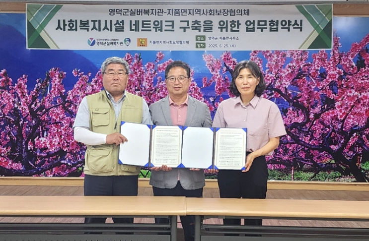 | ▲ 지품면지역사회보장협의체 김상덕 공공위원장(가운데)이 박미숙 영덕군실버복지관장(오른쪽)과 업무협약을 체결하고 있다 |
