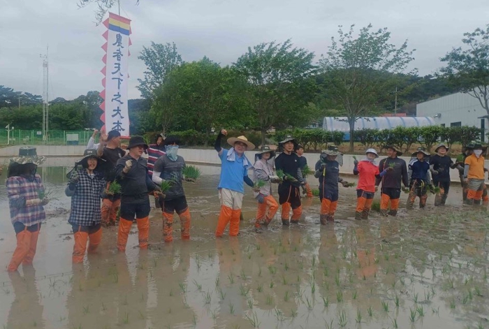 [무한뉴스=정민정 기자] 김기웅 서천군수가 지난 23일 서천군농업기술센터 내 벼 품종 비교전시포에서 직원 40여명과 함께 손 모내기를 진행하며현장 행보에 나섰다.
