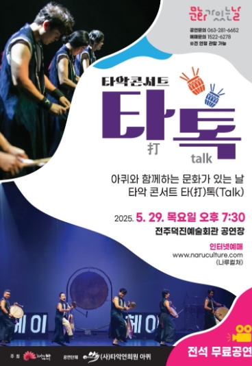 가족의 달을 맞아 마련된 이번 공연은 남녀노소 누구나 즐길 수 있는 역동적이고 흥겨운 타악 퍼포먼스로, ‘타(打) 톡(talk)’이라는 제목처럼 ‘타악이 말한다’는 주제를 중심으로 흥과 감수성이 담긴 창작 무대를 통해 타악의 다채로운 매력을 선보이는 것이 특징이다.