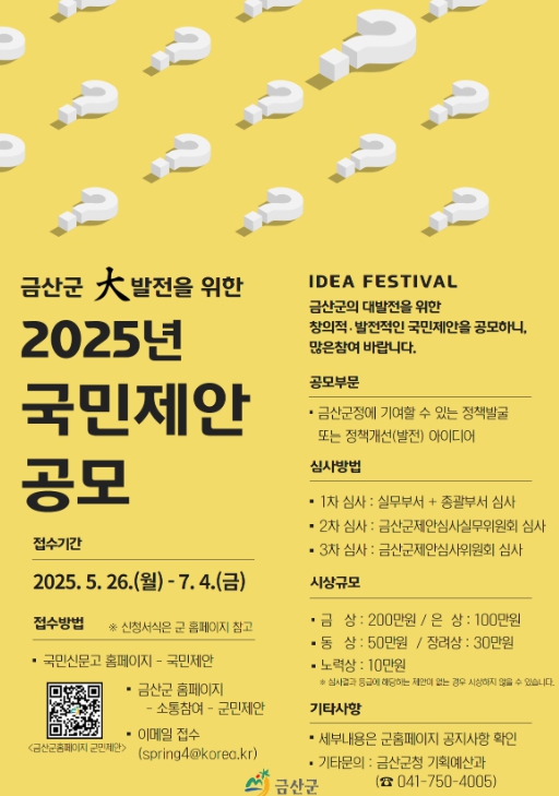 금산군 2025년 국민 제안에 관한 자세한 내용은 금산군청 홈페이지 또는 금산군 기획예산과 기획팀을 통해 확인할 수 있다.