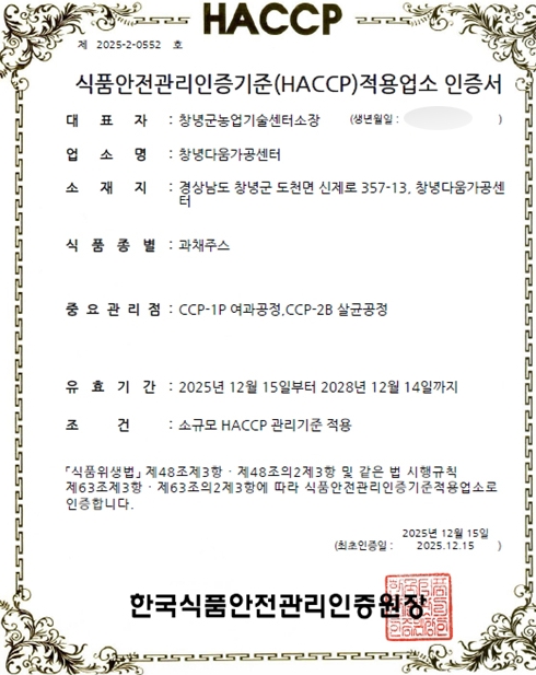 | ▲ 창녕다움가공센터,과채주스 식품안전관리인증기준(HACCP) 인증 |