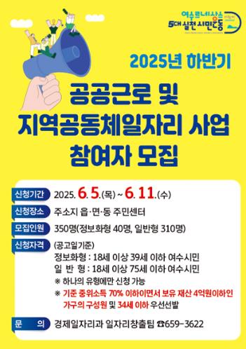[무한뉴스=정민정 기자] 여수시는 취업 취약계층의 생계안정과 청년 근로 능력 향상을 위해 다음 달 5일부터 11일까지 2025년 하반기 공공일자리 사업 참여자를 모집한다고 밝혔다.
