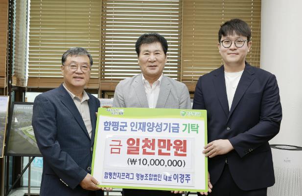 함평군은 26일 “함평천지프러그 영농조합법인이 지난 24일 군 인재양성기금에 1천만 원을 기탁했다”고 밝혔다.
