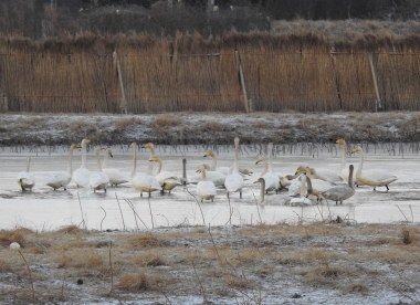 | ▲ 지난 1월 연꽃 복원습지에서 쉬고 있는 큰고니 무리 |