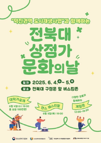 전주시 덕진권역 도시재생 현장지원센터(센터장 서성원)는 오는 4일과 5일 이틀간 전북대 구정문 앞 광장에서 전북대 상인회와 공동으로 ‘전북대 상점가 문화의 날’ 행사를 개최한다.