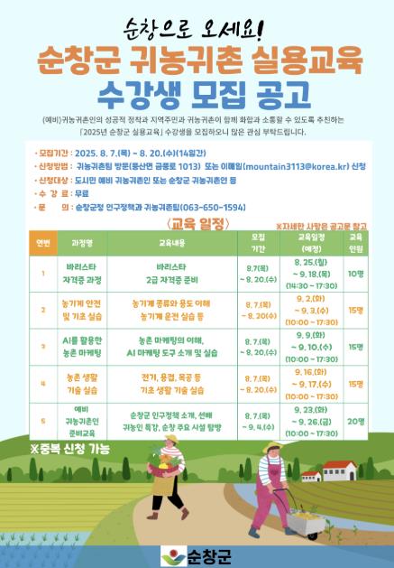 모집 대상은 도시민 예비 귀농·귀촌인 및 순창군에 거주 중인 귀농·귀촌인으로, 수강료는 전액 무료이며 일부 과정은 자격증 취득도 가능하다.