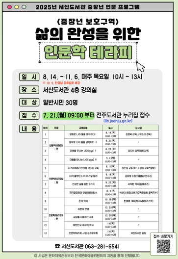 [무한뉴스=정민정 기자] 전주시 서신도서관이 중장년 세대를 위한 맞춤형 인문학 프로그램을 제공키로 했다.