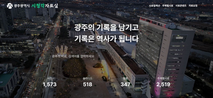 광주시 시청각자료실은 사진, 슬라이드, 필름 등 2만여점의 시청각자료를 디지털로 아카이브한 것으로, 1900년대 광주읍성과 군청, 태봉산 등 사라진 옛 광주의 모습부터 현대의 변화된 도시 풍경까지 광주의 시대별 기록을 보다 체계적이고 직관적으로 만날 수 있다.