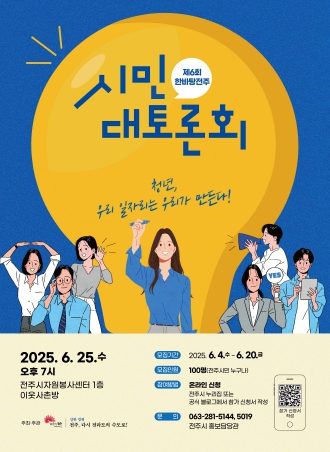 시는 오는 25일 오후 7시, 전주시자원봉사센터 1층 이웃사촌방에서 ‘청년, 우리 일자리는 우리가 만든다’를 의제로 ‘제6회 한바탕전주 시민대토론회’를 개최한다.