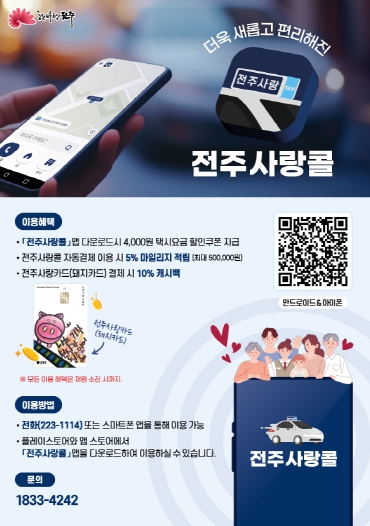 이와 함께 전주사랑콜 앱 이용자 혜택을 대폭 개편해 기존 앱을 다운로드한 후 자동결제카드를 등록하면 제공하던 3000원의 택시요금 할인쿠폰 금액을 4000원으로 인상했으며, 지급대상자 역시 리뉴얼한 전주사랑콜 앱을 다운로드한 모든 이용자로 확대했다.