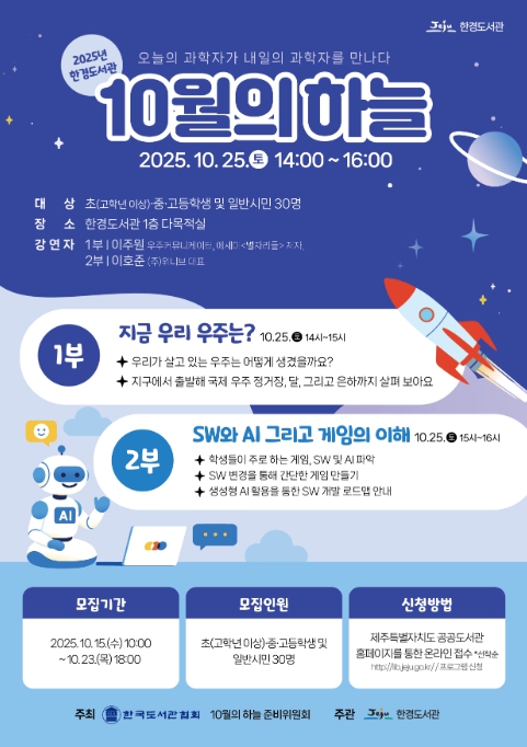 [무한뉴스=정민정 기자] 제주시 한경도서관은 한국도서관협회와 10월의 하늘 준비위원회가 공동 주최하는 ‘10월의 하늘: 과학자들의 재능기부 도서관 과학 강연’ 공모에 선정돼 오는 10월 25일 다목적실에서 강연을 개최한다.