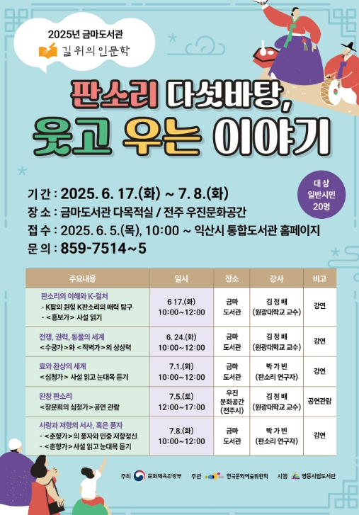 강연은 6월 17일부터 7월 8일까지 매주 화요일 금마도서관에서 진행되며 △흥보가 △춘향가 △수궁가 △적벽가 △심청가에 대한 설명과 해석이 이어진다.