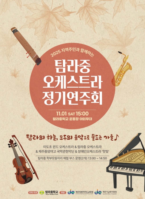 이번 연주회는 2025 예술드림거점학교 및 제주형 자율학교 공동교육과정 운영의 일환으로 마련됐으며 탐라중학교 오케스트라를 중심으로 이도초등학교 윈드오케스트라, 제주중앙여자고등학교 국악관현악단, 장애인오케스트라 ‘핫빛’이 함께 참여한다.