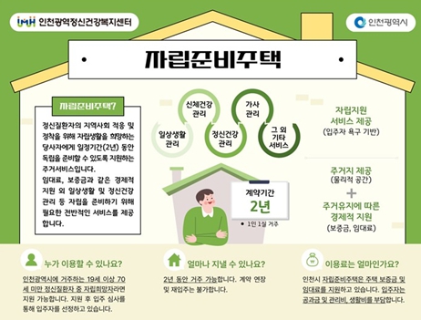 사업은 인천시 수탁기관인 인천광역정신건강복지센터가 총괄 운영하며, 기초정신건강복지센터, 정신재활시설 등 다양한 기관과 협업해 자립지원 프로그램을 운영, 정신응급상황관리, 동료지원가 상담 등을 제공할 예정이다.