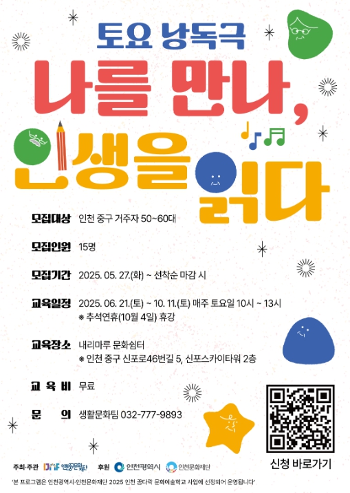 [무한뉴스=정승훈 기자] (재)인천중구문화재단은 인천시와 (재)인천문화재단이 후원하는 2025 인천 꿈다락 문화예술학교 사업의 일환으로 중장년 대상 문화예술 교육 프로그램 ‘토요 낭독극 – 나를 만나, 인생을 읽다’를 진행한다고 5일 밝혔다.