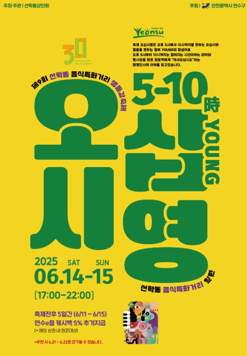 특히, 축제 기간 소비 활성화를 위해 구는 6월 11일부터 15일까지 선학동 음식특화거리 점포에서 연수e음 카드로 결제시 5% 추가 적립급을 지급해 방문객들은 월 50만 원 한도 내 최대 15%의 적립금 혜택을 받을 수 있다.