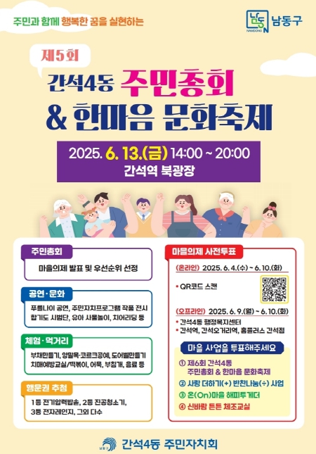 온라인 투표는 6월 4~10일 QR코드를 통해 간편하게 참여할 수 있으며, 현장 투표는 6월 9~10일 동 행정복지센터, 간석역 및 간석오거리역, 홈플러스 간석점에서 진행된다.