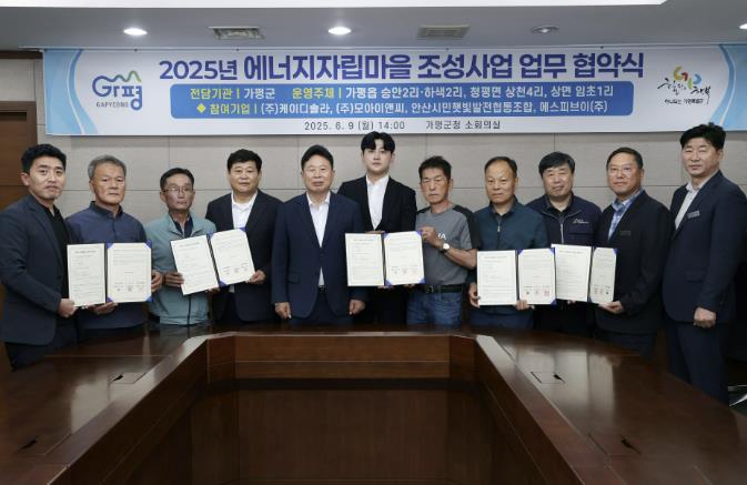 [무한뉴스=정승훈 기자] 가평군은 9일 가평군청에서 올해 처음 추진하는 ‘2025년 에너지자립마을 조성사업’ 협의체 구성을 위한 협약식을 가졌다.