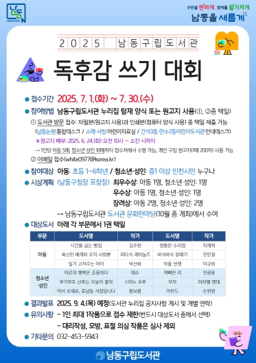 [무한뉴스=정승훈 기자] 인천시 남동구 구립도서관은 7월 1~30일까지 지역 주민을 대상으로 ‘2025년 독후감 쓰기 대회’를 운영한다고 13일 전했다.