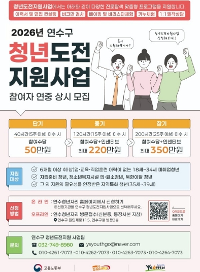 [무한뉴스=정승훈 기자] 연수구는 청년들의 경제 활동과 노동시장 진입을 돕기 위해 ‘2026년 청년도전지원사업’ 참여자를 모집한다.