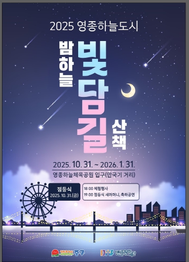 [무한뉴스=정승훈 기자] (재)인천중구문화재단(이사장 김정헌)은 올해 10월 31일부터 오는 2026년 1월 31일까지 3개월간 야간 경관조명 ‘2025 영종 빛 축제 - 영종하늘도시 밤하늘 빛담길’을 운영한다고 밝혔다.