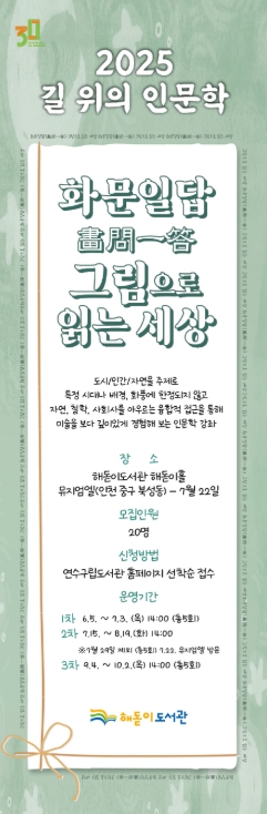 [무한뉴스=정승훈 기자] 연수구 해돋이도서관은 2025년 ‘길 위의 인문학’ 사업 대상 도서관으로 선정되며 이달부터 문화 프로그램을 운영한다.