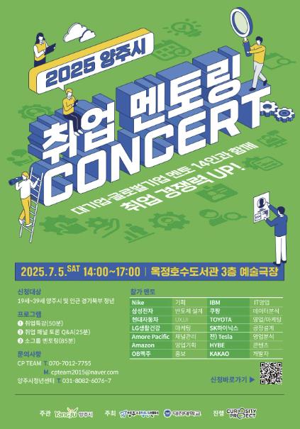 [무한뉴스=정승훈 기자] 양주시가 오는 7월 5일 오후 2시부터 5시까지 옥정호수도서관 3층 예술극장에서 청년 구직자를 위한 ‘2025 취업 멘토링 콘서트’를 개최한다.