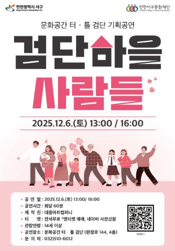 [무한뉴스=정승훈 기자] 오는 12월 6일, 인천서구문화재단이 문화공간 터·틀(검단)의 개관을 기념하는 두 번째 기획공연으로 연극 ‘검단마을 사람들’을 선보인다.