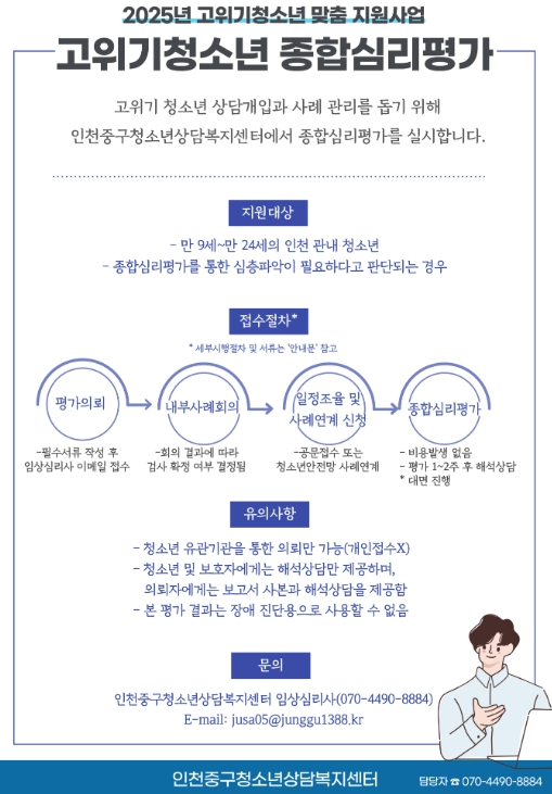 [무한뉴스=정승훈 기자] 인천중구청소년상담복지센터는 심리적 위기를 겪고 있는 청소년의 조기 발굴과 체계적인 지원을 위해 올해부터 ‘고위기 청소년 종합심리평가’ 사업을 본격 운영한다고 4일 밝혔다.