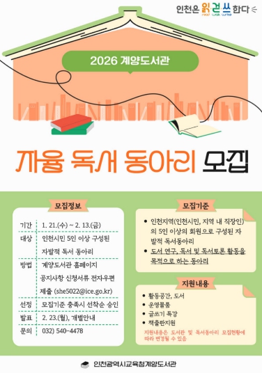 [무한뉴스=정승훈 기자] 인천광역시교육청계양도서관은 지역 내 독서 문화를 확산하고 시민의 자발적인 독서 활동을 지원하기 위해 ‘2026년 자율 독서동아리’를 모집한다.