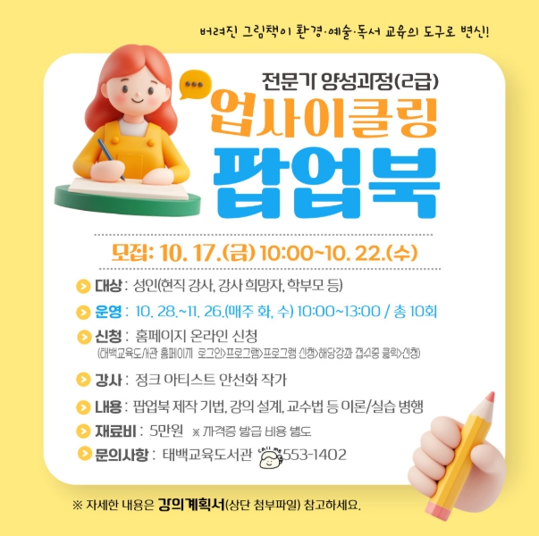 [무한뉴스=정승훈 기자] 강원도교육청 태백교육도서관은 10월 28일부터 11월 26일까지 지역 내 지속 가능한 친환경 교육문화 확산 과 환경교육 전문 인력 양성을 위해 ‘2025년 업사이클링 팝업북 강사 자격과정’을 운영한다.